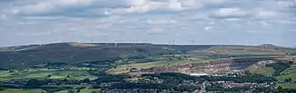 Scout Moor est un haut marais de tourbière et de bruyère dans les Pennines du Sud[2], atteignant une altitude de 473 m à son sommet, Top of Leach[4],[5]. La géologie du sous-sol, mélange de roches dures et de schistes tendres, possède de basses couches de houille. La roche et les schistes s'érodent à des rythmes différents, ce qui donne à la zone un paysage rempli d'escarpements abrupts séparés par des reliefs en pente, même si le sommet principal de la lande est plat et arrondi[5]. La lande couvre une superficie d'environ 1 347 acres (545 ha)[6], dont moins de 21 acres (8,5 ha), environ 2 %, sont occupés par le parc éolien.