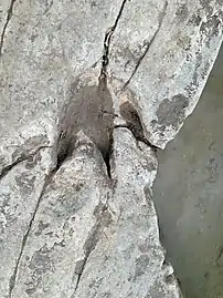 - Diplocraterion (en), un ichnotaxon d'invertébré en forme en "U" dont la partie entre les branches du "U" laisse des fossiles faits d'empilements d'éléments en forme de feuillets[21].
