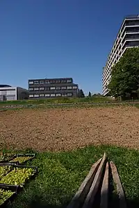 Dépendances agricoles en cours de rénovation, au deuxième plan le cycle d'orientation de De-Budé
