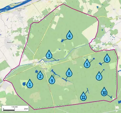 Le site comprend plusieurs étangs : de Halay, la Fontaine, la Baquetière, la Grande-Brèche, Montrieux, Neuf, la Faisanderie, le Périou, la Thibaudière et les Bonshommes[7].