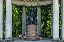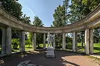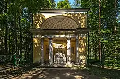 - Plus loin, le Pavillon de Rossi, construit à l'emplacement de l'ancien théâtre, date de 1913, selon les plans de l'architecte pétersbourgeois Carl Schmidt d'après un projet inabouti de Carlo Rossi de 1816. Le pavillon se présente en demi-cercle comme une charmante gloriette avec des colonnes et une coupole hémisphérique. Au milieu un monument en mémoire de l'impératrice est placé en 1914 par le sculpteur Vladimir Beklemichev[1].