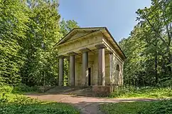 - Le Mausolée à l'Époux bienfaiteur a été construit en 1806-1819 en mémoire de l'empereur Paul Ier, selon un dessin de Jean-François Thomas de Thomon. Le mausolée prend la forme d'un temple grec tétrastyle. Ses colonnes doriques de granite rouge reposent sur un fondement de granite et soutiennent un fronton avec l'inscription « À l'Époux bienfaiteur ». Une frise représente une suite de masques tragiques les yeux fermés desquels coulent des larmes. On remarque à l'intérieur une sculpture monumentale, œuvre d'Ivan Martos, représentant une femme majestueuse et éplorée avec une urne funéraire; la famille de l'empereur Alexandre Ier de Russie est représentée sur le piédestal.