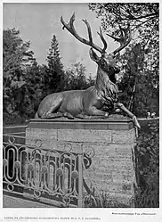 | L'un des aspects du parc | La colonne de la princesse Lieven | L'une des quatre statues de cerf au début du XXe siècle | Le Pont aux Cerfs |