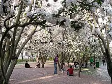 De début à mi-avril, les arbres du parc, que l'on appelle en Europe, des cognassiers du Japon, sont en fleur donnant une atmosphère rose au parc[2].