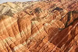 Zhangye Danxia est réputé pour les couleurs inhabituelles des rochers. Ces dernières résultent d'environ 24 millions d'années de dépôt de grès rouge et d'autres minéraux du conglomérat du Crétacé (-80 millions d'années), donnant un résultat semblable à un mille-feuille[3]. Vers -65 millions d'années, de nombreuses failles ont fait leur apparition[3]. Vers -23 millions d'années, des mouvements géologiques, liés à la plaque tectonique responsable de l'Himalaya, ont perturbé les terres autour du relief de Danxia dans la province chinoise du Guangdong[3]. Le vent, la pluie et le temps ont sculpté les montagnes selon différentes formes particulières, notamment en chevrons[4], un processus d'érosion étalé sur 6 millions d'années[5].