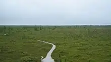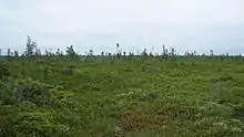 Les tourbières, installées dans les dépressions mal drainées, recouvrent 21 % de Kouchibouguac[17]. La tourbe peut atteindre une épaisseur de 6 mètres au centre des dépressions[17]. Outre la sphaigne, on y retrouve des éricacées et quelques rares arbres[17]. Les marais salés couvrent environ 3 % du parc[18]. On y retrouve 72 espèces de végétaux (huit arbustes, trois mousses et 61 espèces de plantes herbacées[18]). Malgré la faible superficie qu'ils couvrent, ils servent de lieu de reproduction pour la plupart des oiseaux du parc[18].