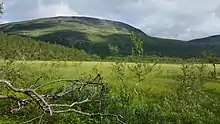 Vádvečohkka (à droite) et la vallée encaissée de Vádvejohka vus depuis le sud en avril.