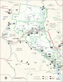 Long d'environ 75 km pour une largeur variant de 30 à 40 km, le parc national des North Cascades n'est, en réalité, qu'une partie d'un complexe composé de quatre zones distinctes. Le parc à proprement parler est composé d'une zone septentrionale et d'une zone méridionale. Ces deux zones sont séparées par la zone récréative de Ross Lake National Recreation Area au niveau de la vallée du fleuve Skagit. La quatrième zone, située à l'extrémité sud du complexe, est la zone récréative de Lake Chelan National Recreation Area[3].