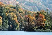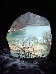- le lac Kozjak ou Jezero Kozjac : situé à 534 m d'altitude, il termine l'enchaînement des lacs supérieurs. Il doit son nom à la légende racontant qu'une trentaine de chèvres (koza en croate) s'y seraient noyées. Il est alimenté secondairement par la Rječica, une rivière formée par de nombreuses sources originaires du versant est du Bijeli vrh, à 780 m d'altitude. Ce lac a une superficie de près de 81,5 ha, ce qui en fait le plus grand de tous, et une profondeur maximale de 46 m. Il mesure 2,35 km de long, et entre 135 et 670 m de large selon l'endroit. Au fond du lac se dresse encore aujourd'hui une ancienne barrière de travertin qui devait autrefois former une chute de plus, désormais engloutie quatre mètres sous la surface. Le lac Kozjak compte un îlot ovoïde de 1,4 ha, appelé « îlot de Stéphanie » en mémoire de Stéphanie de Belgique, qui visita le site à la fin des années 1800[9],[10].