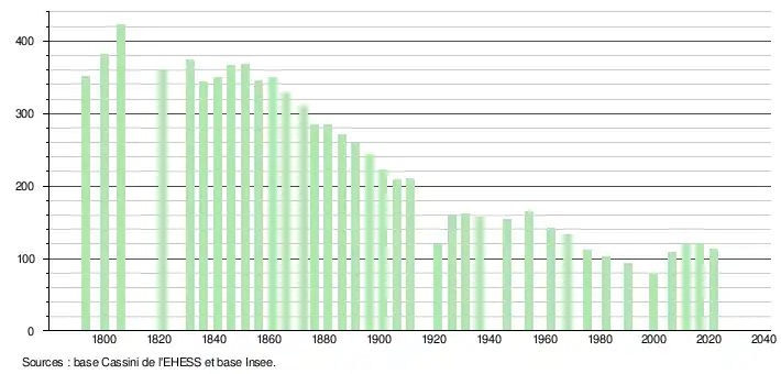 L'évolution du nombre d'habitants est connue à travers les recensements de la population effectués dans la commune depuis 1793. Pour les communes de moins de 10 000 habitants, une enquête de recensement portant sur toute la population est réalisée tous les cinq ans, les populations légales des années intermédiaires étant quant à elles estimées par interpolation ou extrapolation[15]. Pour la commune, le premier recensement exhaustif entrant dans le cadre du nouveau dispositif a été réalisé en 2006[16].