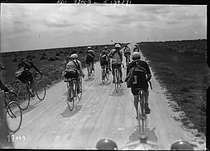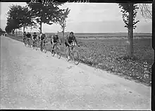 | Le peloton avant Artenay (Loiret) lors de la course cycliste Paris-Bourges du dimanche 6 août 1922. | |||