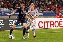 Après avoir réalisé un mercato et une préparation tardive la saison dernière, le duo Echouafni - Cheyrou s'attache en ce début de saison 2019-2020 à obtenir un groupe très étoffé et complet[108]. L'effectif se renforce de la milieu internationale allemande Sara Däbritz, rejointe par deux jeunes espoirs : la milieu française Léa Khelifi et l'internationale canadienne Jordyn Huitema. La Norvégienne Karina Sævik rejoint également le PSG. Le début de saison parisien est quasi parfait, les troupes d'Echouafni enchaînant six succès de rang en championnat, avec une attaque aussi prolifique que celle de l'OL et une défense plus solide que celle de son rival[109]. Nouveauté du calendrier, le PSG est opposé à l'Olympique lyonnais pour la première édition du Trophée des championnes. Battu aux pénaltys, le PSG s'incline alors qu'il a montré qu'il était en mesure de contester sur le terrain l'OL, bousculé par périodes[110]. En Ligue des champions, le PSG élimine facilement les Portugaises du SC Braga malgré un match nul au retour (7-0, 0-0), puis les Islandaises de Breidablik (4-0, 3-1)[111]. À la suite de cela, le PSG vit un mois de novembre compliqué et enchaîne les déconvenues en championnat en concédant deux nuls contre Guingamp et Montpellier[112],[113], et une défaite contre Lyon[114]. Au retour de la trêve hivernale, le PSG se reprend et enchaîne les larges victoires en championnats et en Coupe de France jusqu'à l'arrêt des compétitions à la suite de la pandémie de Covid-19[115]. Après 5 mois d'arrêt, les Parisiennes, renforcées de la Suisse Ramona Bachmann, retrouvent la compétition à l'occasion des demi-finales de Coupe de France. Elles renversent les Girondines 2 buts à 1 et se qualifient en finale face à l'Olympique lyonnais. Lors de la finale, elles n'arrivent pas à trouver la faille dans la défense lyonnaise et s'inclinent une nouvelle fois aux tirs au but. Elles enchaînent avec la fin de la Ligue des champions, organisée sous forme d'un Final 8 dans le Pays basque, en Espagne. En quarts de finale, elles dominent Arsenal 2 buts à 1 malgré quelques périodes de relâchement[116], et retrouvent l'OL pour une demi-finale 100 % française. Le match se conclut par la défaite du PSG 0-1 sur un but de la tête de Wendie Renard dans une rencontre pauvre en occasions[117].