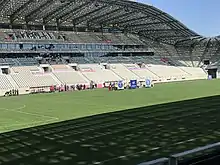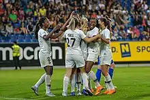 Durant l'inter-saison 2018-2019, Olivier Echouafni, ancien sélectionneur de l'équipe de France féminine, est nommé entraîneur de l'équipe féminine[91]. Le PSG espère insuffler une nouvelle dynamique en rajeunissant son effectif, il laisse partir la meilleure buteuse du club Marie-Laure Delie à Metz, et Érika aux Corinthians[92] avant de recruter deux internationales, la jeune défenseure brésilienne Daiane[93] et la star chinoise Wang Shuang[94]. Jennifer Hermoso, ayant le mal du pays, est libérée de son contrat et retourne en Espagne[95]. Le début de championnat se passe assez bien pour le PSG malgré quelques matchs gagnés difficilement à l'image de sa victoire 1-0 contre le FC Fleury 91 sur pénalty[96]. Les Parisiennes concèdent toutefois un nul face au LOSC[97] mais parviennent à rester au contact de l'Olympique lyonnais en obtenant un nul face à cette équipe au Stade Jean-Bouin avec plus de 8 000 supporters parisiens, un record pour le PSG à domicile en championnat[98]. En Ligue des champions, le PSG obtient de solides résultats lors des deux premiers tours en allant s'imposer à la fois à l'extérieur puis à domicile face au SKN St. Pölten lors des seizièmes de finale[99] puis face au Linköpings FC lors des huitièmes malgré quelques frayeurs[100]. Après la trêve, le PSG monte en puissance et enchaîne les victoires par au moins 2 buts d'écarts en vue d'un match décisif face à l'Olympique lyonnais pour le titre en avril. En Coupe de France, après avoir écrasé le CPB Bréquigny 8-0[101], le PSG s'impose difficilement au Havre 1-0 mais se qualifie ainsi pour les quarts de finale[102] face aux Lyonnaises en . Dans une rencontre jouée au Groupama Stadium, le PSG s'incline sur le plus petit score et échoue ainsi à conserver son titre[103]. En , les Parisiennes tombent sur Chelsea en quart de finale de Ligue des champions. Lors du match aller dans la banlieue de Londres, les joueuses du PSG s'inclinent 2 à 0 en fin de match et sont ainsi condamnées à l'exploit lors du retour au Stade Jean-Bouin à Paris[104]. Elles réalisent alors un grand match en rattrapant d'abord les deux buts mais se font éliminer cruellement avec un but de Chelsea lors du temps additionnel[105]. Ne reste alors plus que le championnat dans lequel les Parisiennes vont jusqu'à égaler aux points l'OL juste avant leur rencontre décisive bénéficiant d'un match nul concédé par les Lyonnaises[106]. Les Parisiennes s'inclinent toutefois lourdement face à l'OL 5-0 au Groupama Stadium le devant près de 26 000 spectateurs, un record pour le championnat de France. Elles laissent ainsi filer l'OL vers une treizième titre consécutif[107].