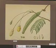 Les pétioles des feuilles alternes font de 2-6 cm et comptent de 14 à 18 paires de pennes munies chacune de 31 à 38 paires de folioles[2] de 6 à 9 cm de long[3].