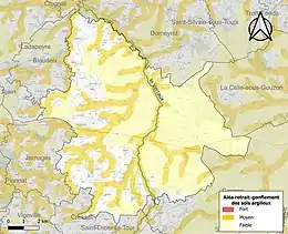 Le retrait-gonflement des sols argileux est susceptible d'engendrer des dommages importants aux bâtiments en cas d’alternance de périodes de sécheresse et de pluie. 29,5 % de la superficie communale est en aléa moyen ou fort (33,6 % au niveau départemental et 48,5 % au niveau national). Sur les 521 bâtiments dénombrés sur la commune en 2019, 100 sont en aléa moyen ou fort, soit 19 %, à comparer aux 25 % au niveau départemental et 54 % au niveau national. Une cartographie de l'exposition du territoire national au retrait gonflement des sols argileux est disponible sur le site du BRGM[15],[16].