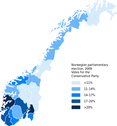 Le Parti conservateur a toujours été plus fort dans le sud-ouest de la Norvège et dans la grande région d'Oslo. Høyre est actuellement au pouvoir dans les quatre plus grandes villes de Norvège : Oslo, Bergen, Stavanger et Kristiansand. Aussi, c'est le parti le plus important de ces quatre villes. Plus de la moitié des Norvégiens vivent dans des villes dirigées par Høyre.