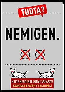 Lors de la campagne du référendum hongrois sur les quotas de migrants de 2016, le Parti du chien à deux queues adopte l'idée de plusieurs organisations non gouvernementales, comme l'Union pour les libertés civiles (en) (Társaság a Szabadságjogokért, TASZ) ou le comité Helsinki hongrois, qui appellent à voter nul en cochant à la fois « oui » et « non »[4]. Sa levée de fonds en vue de faire campagne en ce sens recueille en quelques semaines une somme suffisante[5] pour des centaines de grandes affiches parodiques où figurent, entre « Le saviez-vous ? » des affiches du gouvernement et « À question conne réponse conne. Votez nul », des messages souvent inspirés des affiches d'origine, tels que « Depuis le début de la crise migratoire, il y a plus d'affiches bleues en Hongrie que de migrants » ou « C'est les étrangers qui ont représenté le plus grand danger pour les sportifs hongrois aux Jeux olympiques »[6],[7].