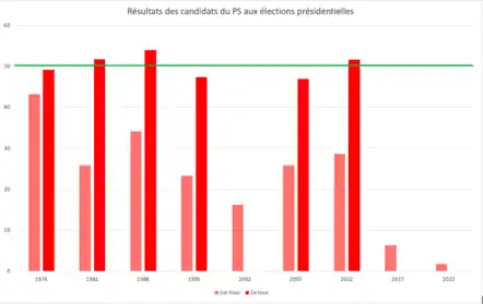 Après le quinquennat de François Hollande, le Parti socialiste réalise deux scores historiquement bas à l'élection présidentielle : en 2017 avec la candidature de Benoît Hamon (6,36 % des suffrages) et en 2022 avec celle d'Anne Hidalgo (1,75 %). Le parti adhère ensuite à la coalition de gauche Nouvelle Union populaire écologique et sociale (NUPES), ce qui conduit à des contestations en interne, une partie des adhérents rejoignant le mouvement La Convention de Bernard Cazeneuve.
