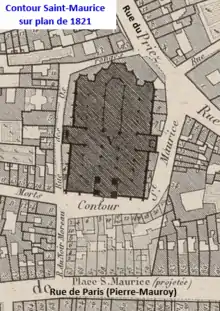 L'extrémité sud-est du parvis, nommé « Contour Saint-Maurice » jusqu'à l'agrandissement de l'église de 1867 à 1877 (qui entraine la démolition de l'ilot entre l'ancienne façade et la rue de Paris), est restée dans sa largeur d'origine (ou du début du XVIIe siècle) ce qu'atteste la Maison du Renard. Avant cet agrandissement, le contour se prolongeait le long de la façade de l'église jusque dans l'axe de la rue des Morts (actuelle rue Schepers).