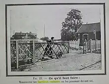 À la fin du XIXe siècle, plusieurs types de barrières existent : à palissade, à vantaux ou coulissantes. Certaines sont suffisamment faciles à manier pour pouvoir être maniées par une femme[9]. Les systèmes de fermeture varient : certaines barrières sont fermées en permanence et ne sont ouvertes qu'au passage des automobiles, tandis que d'autres ne se ferment qu'au passage des trains[9].