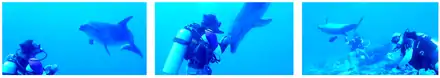 Plongeurs et dauphins dans la passe de Tiputa.
