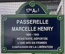 C'est le , que cette passerelle prend la dénomination de passerelle Marcelle-Henry. Il s'agit de l'une des trois voies parisiennes baptisées en mémoire de femmes résistantes compagnon de la Libération[3].
