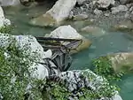 Cette passerelle est le seul ouvrage pour piétons traversant la rivière; elle est très utilisée par les nombreux touristes qui empruntent les sentiers qui longent la rivière. Cette passerelle mesure 45 m de long. C'est un arc en acier comprenant une structure tridimensionnelle avec une section en forme de V. Le site de cet ouvrage n'est pas accessible par la route, aussi les éléments de la passerelle ont-ils été manufacturés en atelier, transportés par hélicoptère et assemblés sur place. L'architecte Dominique Putz est l'auteur du projet et l'ingénieur Alain Ranvier a effectué les calculs de structure[3]