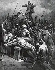 Les Évangiles déclarent alors que les vêtements de Jésus lui furent retirés par les soldats, pour être répartis entre eux en plusieurs lots[23]. L’Évangile selon Jean affirme que ceci accomplit une prophétie du Psaume 22 (partage des vêtements)[24]. D’après Luc, les deux brigands crucifiés aux côtés de Jésus lui parlent. Luc déclare que l’un railla Jésus, et que l’autre le respecta, et que Jésus déclara que le voleur respectueux, Dismas (le bon larron), gagnerait promptement son entrée au paradis ; traditionnellement l’autre, Gesmas ou Gestas (le mauvais larron), est considéré comme voué à l’enfer. Dismas est considéré comme sauvé par Jésus, par sa seule déclaration de foi : « Aujourd'hui tu seras avec moi dans le paradis »[25].