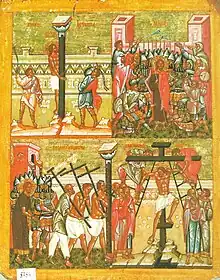 Une fois condamné à mort par Pilate, il est d’abord flagellé, c’est-à-dire lié à une colonne où il est frappé avec un fouet aux lanières lestées d’os ou de métal (Brown et al., 628) ou d'un long clou.