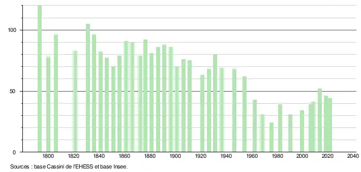 L'évolution du nombre d'habitants est connue à travers les recensements de la population effectués dans la commune depuis 1793. Pour les communes de moins de 10 000 habitants, une enquête de recensement portant sur toute la population est réalisée tous les cinq ans, les populations légales des années intermédiaires étant quant à elles estimées par interpolation ou extrapolation[50]. Pour la commune, le premier recensement exhaustif entrant dans le cadre du nouveau dispositif a été réalisé en 2008[51].