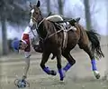 La circonférence est l'élément caractéristique du canard, et c'est excitant. Deux cavaliers montent à toute vitesse, chacun prenant le canard par une poignée; par des secousses propres, ils essaient de s'emparer du canard. Notez que celui qui "offre" fait toujours des sangles avec sa main droite; la main qui ne serre pas doit tenir les rênes. Pendant le serrage, il est interdit de s'appuyer sur la chaise. Le canard nécessite un cheval entraîné et une grande agilité de la part du cavalier pour ramasser, sangler, gifler et convertir.