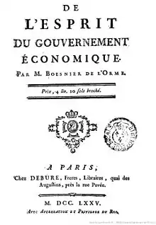 - Pierre Drouet d'Aubigny, La doctrine économique de Boesnier de l'Orme d'après son ouvrage, "De l'Esprit du Gouvernement économique", Paris, 1908.