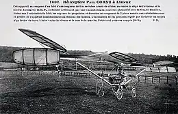 L’hélicoptère Paul Cornu était muni d’une selle, de quatre roues de vélo et de deux hélices sustentatrices de six mètres de diamètre en guise de rotor. Son moteur était un Antoinette de 24 ch. C’est une immense courroie de 22 mètres qui actionne les deux hélices. À chaque extrémité de l’appareil, un plan inclinable reçoit l’air refoulé par l’hélice et assure la propulsion horizontale. Le poids de l’appareil atteignait 330 kg (avec le pilote)[6].