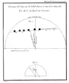 Parmi les observations astronomiques, les éclipses de Lune (ici au nombre de quatre) sont intéressantes pour déterminer la longitude mais, l'observation la plus complète est celle du passage de Vénus sur le Soleil qui a lieu le . Cet évènement astronomique était attendu au plan international et, en France, le cardinal de Luynes est cité pour avoir obtenu un des meilleurs résultats, au même titre que Lalande, Granjean de Fouchy, la Condamine, le Monnier, Maraldi, la Caille, etc[20].