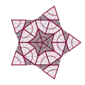 Le pavage construit autour de pentagones, P1, est en fait le premier découvert par Penrose, qui s'est inspiré d'abord des recherches de Johannes Kepler[7]. Il est bien connu qu'on ne peut couvrir le plan avec des pentagones réguliers, mais trois autres pièces suffisent pour combler les interstices, tout en imposant l'ordre apériodique. Ces pièces sont un losange fin, un pentagramme et un « bateau », qui représente à peu près les 3/5 d'un pentagramme. Pour la construction directe du pavage apériodique, il faut aussi distinguer trois sortes de pentagones. Une solution bien plus simple consiste à esquisser des pentagones sur les losanges fins et gros qu'on arrange en pavage de type 3.