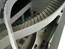La spirale d’un monumental escalier de 79 marches[41] au garde-corps transparent, s’élance sur trois niveaux, d’une mezzanine à l’autre, depuis le sous-sol.