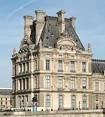 Il est reconstruit dans les mêmes proportions, mais orné d'une façade réalisée dans le nouveau style établi par Lefuel à partir de la Cour Napoléon[1], visant à harmoniser les différents styles constituant le Louvre. Il est notamment orné des sculptures de Jean-Baptiste Carpeaux, dont son Triomphe de Flore. Au cours du XXe siècle, il abritait, entre autres départements, l'espace d'exposition temporaire du cabinet des arts graphiques, les peintures de l'école espagnole du XVIIe siècle et les sculptures du XIXe siècle[2], lesquelles bénéficiaient alors de la triple exposition de l'éclairage naturel de l'étage.