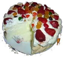 La pavlova est un dessert à base de meringue, nappé de crème chantilly et recouvert de fruits frais (ananas, kiwi, mangue, fruits rouges, …)[1]. Ce dessert fut ainsi nommé en l'honneur de la ballerine russe Anna Pavlova[1],[2]. La spécificité de la pavlova est d'être croustillante à l'extérieur et moelleuse à l'intérieur.