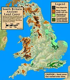 La superficie totale du pays de Galles est de 20 779 km²[1], ce qui correspond à 9% de la superficie de la Grande-Bretagne. Une grande partie du paysage est montagneux avec des landes et des bruyères dépourvues d'arbres, ainsi que de grandes surfaces composés de dépôts de tourbe. La côte s'étend sur environ 1 200 km[2] et fait face à une cinquantaine d'îles, dont la plus grande est Anglesey. Le climat est humide et maritime, avec des étés chauds et des hivers doux[3] tout comme le climat médiéval tardif, bien que le climat soit devenu significativement plus frais et beaucoup plus humide au début de l'ère[4]. La côte sud-est était à l'origine une zone humide, mais son assèchement se poursuit depuis l'époque romaine.