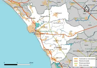 Située à l'ouest du département de la Vendée, la communauté d'agglomération du Pays de Saint-Gilles-Croix-de-Vie regroupe 14 communes et présente une superficie de 292,2 km2[4]. Géographiquement, elle appartient au Bas-Bocage[5]. La superficie du territoire communautaire est de 29 224 hectares, avec une altitude variant de 0 (dans plusieurs communes) à 61 mètres (à Coëx)[6].