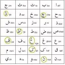 | ح ha | چ cha | خ kha | د dal | ڎ ḍa |