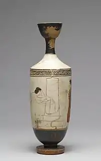 Un exemple de lécythe à fond blanc du peintre Thanatos est un vase (440 - 430 av. J.-C.) conservé au Walters Art Museum[6]. Les femmes pleurent un défunt. Il y a un personnage masculin qui s'approche du côté droit du lécythe et que les femmes ne voient pas et qui une représentation du mort[6]. Les Grecs pensaient que les défunts s'attardaient sur leur tombe après leur mort[7].