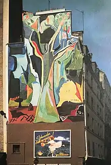 - Paris : Les bâtiments publics et églises sont souvent décorés de peintures murales de techniques variées: Petit Palais, Sorbonne, Théâtre des Champs-Élysées, église Saint-Sulpice, Opéra, Hôtel de Ville, etc. De nombreux trompe-l'œil et pochoirs ornent les murs de la capitale. La période de mai 1968 a vu l'éclosion de multiples graffitis contestataires et de peintures sur les murs, notamment, de Paris et de la Sorbonne. Le quartier de La Défense, parmi ses 70 œuvres monumentales, expose trois peintures monumentales réalisées par Guillaume Bottazzi[26], Jean Dewasne[27] et Catherine Feff[28].