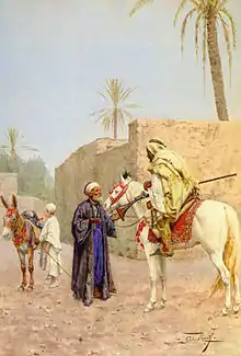 La peinture orientaliste est profondément liée au voyage. Il est vrai que certains artistes n'ont pas quitté l'Europe ou les États-Unis, comme Antoine-Jean Gros, néanmoins célèbre pour son Bonaparte et les pestiférés de Jaffa. Toutefois, beaucoup ont effectivement voyagé au Maghreb ou au Machreq[1]. Ce fut le cas d'Eugène Delacroix qui se rendit au Maroc et à Alger en 1832, d'Alexandre-Gabriel Decamps qui se déplaça en Grèce puis en Asie mineure en 1827, de Prosper Marilhat qui accompagna une expédition scientifique en Grèce, en Syrie, au Liban, en Palestine et en Basse et Haute-Égypte de 1831 à 1833, ou de Théodore Chassériau qui, en 1846, se rendit à Constantine puis à Alger ; et encore, jusqu'en 1914, de Matisse, Fromentin, Vernet, Maxime du Camp, Dinet, Kandinsky[1], Eugène Villon ...