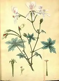 Linné ne pouvait donc pas avoir connaissance de cette plante dans Species Plantarum publié en 1753. Il y décrit 20 espèces de géraniacées d'origine africaine (à 7 étamines fertiles) qu'il classe parmi les Geranium[4]. La première description de Pelargonium grandiflorum est redevable au botaniste allemand Willedenow (1765-1812) qui décrivit des espèces nouvelles quand il révisa les Geraniaceae pour la réédition de Species Plantarum[5], en 1800. Il reclasse les géraniacées africaines à 7 étamines fertiles dans l'ordre des Pelargonium, créé auparavant par L'Héritier.