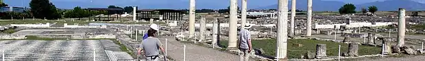 Une grande basilique paléochrétienne fouillée au nord des « Bains d'Alexandre » appartient également à cette ville romaine tardive[63]. Elle est située dans un quartier encore mal connu, protégé par un rempart. Il s'agit d'une église du type de la basilique à charpente, avec trois nefs, un narthex, un exonarthex et un atrium. Le bâtiment mesurait en tout 42,50 × 20,20 m et se terminait à l'Est par une abside semi-circulaire de 7,50 m de diamètre, où a été retrouvé le synthronon épousant la forme de l'abside et recouvert d'un placage de marbre. Le sol du sanctuaire, de la nef centrale et de la partie centrale du narthex étaient recouverts d'opus sectile, tandis que des mosaïques plus grossières à motifs géométriques occupaient les nefs latérales, le reste du narthex et l'exonarthex. La datation des pavements d'opus sectile, qui peuvent être rapprochés, en Macédoine même de ceux d'Amphipolis ou de Philippes (Octogone et Basilique C), par exemple, situe la construction de l'église vers le milieu du Ve siècle. À la suite d'une première destruction, la basilique est reconstruite, avec quelques modifications du plan, au VIe siècle : les ailes latérales sont surélevées par une tribune, auquel on accède par des escaliers dans le narthex ; des accès monumentaux (portiques) relient l'église à une rue de la ville d'un côté et au baptistère de l'autre. La destruction intervient subitement au début du VIIe siècle, probablement par un séisme. La zone connaît ensuite une occupation limitée, de type résidentielle, à l'époque byzantine, à laquelle est associée une petite église, édifiée à peu de distance à l'ouest des ruines de la grande basilique paléochrétienne.