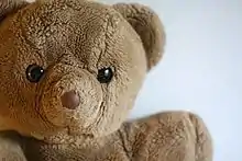 Par extension, on appelle peluche un jouet constitué de peluche rembourrée représentant un personnage (animal ou autre) ; au Québec, où l'emploi de peluche n'est pas fréquent, toutou, issu du langage enfantin, est utilisé dans la langue courante pour désigner un jouet en peluche[2].