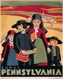 Ces Deutschländer ont immigré en Pennsylvanie, où beaucoup se sont fait connaître dans les affaires de l'église, des journaux et des affaires urbaines[9],[8]. Plus tard, après la création du premier Empire allemand unifié en 1871, le terme "Dutch" a commencé à être utilisé pour identifier les habitants du Pennsylvania dutch country[10],[11],[12].