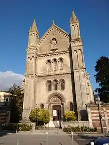 La porte à voussures chevronnées, est ornée, dans son tympan, du Sacré-Cœur en bas relief, entouré des anges chargés des emblèmes de la Passion du Christ. Au-dessus, deux étages de fenêtres géminées éclairent le vestibule et la tribune. Plus haut, la statue du Bienheureux, sur un pignon avec arcatures et corbeaux variés, et couronné de la croix nimbée.