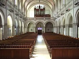 L'édifice est d’une seule nef, en forme de croix latine, accompagnée d'ambulatoires qui permettent une facile circulation en dehors des piliers, et les deux bras servent de porches d’accès pour les élèves du pensionnat.</* XIXe siècle */ br /> Le chœur, de forme circulaire, est pavé en mosaïque, décoré d'arcatures, frises et corbeaux variés. Dans le fond, un édicule avec voussure et imbrications devra supporter un reliquaire. Au-dessus s'élève la statue du Sacré-Cœur.